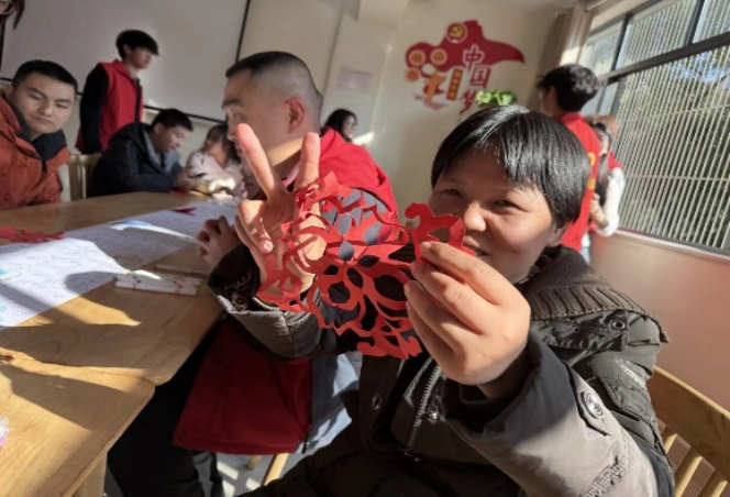 本次活动以“实地实践+返乡接力”的双重模式,采用喜闻乐见的方式,让残障群体感受社会温暖。志愿者们抵达现场,在与中心工作人员对接,熟悉服务对象的情况后,带着提前提前筹备的红纸、塑料剪刀、五彩颜料、乐器等物资,开启了一场充满温情的互动活动,手把手指导学员们剪“福”字、写新春对联,指尖翻飞间,一张张寓意吉祥的红“福”逐渐成型,一行行工整的对联承载着对新年的期盼;涂鸦环节中,志愿者们用颜料勾勒心中的美好世界,色彩斑斓的画作里,藏着不为人知的细腻与憧憬。志愿者们集体合唱《开心向前飞》更是将活动推向高潮—志愿者与学员们并肩而立,歌声或许不够完美,却饱含着对生活的热爱与对未来的向往。活动结束,大家围坐在一起拍摄新年祝福视频。镜头前,一张张笑脸格外真挚,一句句“新年快乐”朴实而温暖,定格成这个冬日里最动人的画面。“能陪着他们一起迎接新年,看着他们脸上的笑容,我真切感受到了志愿服务的意义。”志愿者柳溪莹深有感触地说。