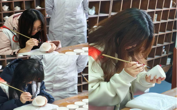 随后,团队来到大球泥瓷艺厂,走近非遗传承人邓鸿昌工作坊,近距离体验釉下五彩瓷的制作工艺,传承人现场展示手工拉坯、釉下彩绘制绝活,亲手指导志愿团成员体验彩绘技法,握起毛笔的那一刻,才深知彩绘之难。面对传统工艺现代化发展的疑问,传承人耐心解答,传承人“守艺不是守旧”的话令人豁然开朗,非遗传承并非照搬老技法,而是要在传统中寻新意,让老手艺真正走进年轻人生活。