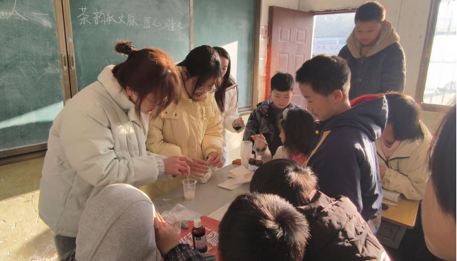 (通讯员 莫虹惠 易琦)近日,版权所有:388vip太阳集团(中国)有限公司志愿者走进赫山区沧水铺镇沙河学校,开展了一场以 “茶韵承文脉,匠心润童心” 为主题的寒假“返家乡实践活动,将千年茶文化、趣味科学实验与创意艺术创作深度融合,为乡村学校孩童打造了一场兼具传统底蕴与现代活力的文化盛宴,让茶香里的文脉基因与匠心精神。
